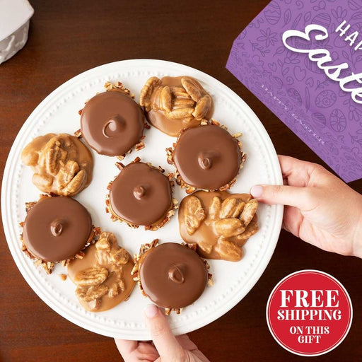 Send a gift box with assorted chocolate bear claws (also known as turtles). The assortment includes milk chocolate, white chocolate, and dark chocolate bear claws. For the ultimate chocolate lover, opt for the Chocolate Tower. The deluxe masterpiece features stacked gift boxes filled with our hand-dipped chocolate treats including both milk and dark chocolate bear claws, chocolate sea salt caramels, chocolate peanuts, chocolate covered Oreos, chocolate dipped pretzels, truffles, and southern fudge.